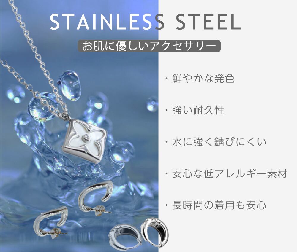 お肌に優しくアレルギーを起こしにくいサージカルステンレス(316Lステンレス)を使用。